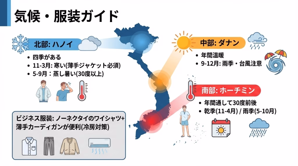 ベトナムは南北に長い国で、地域によって気候が大きく異なります: