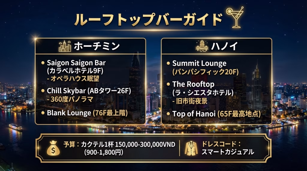 - 20:00〜22:00:ルーフトップバーで夜景を楽しむ、または街歩き