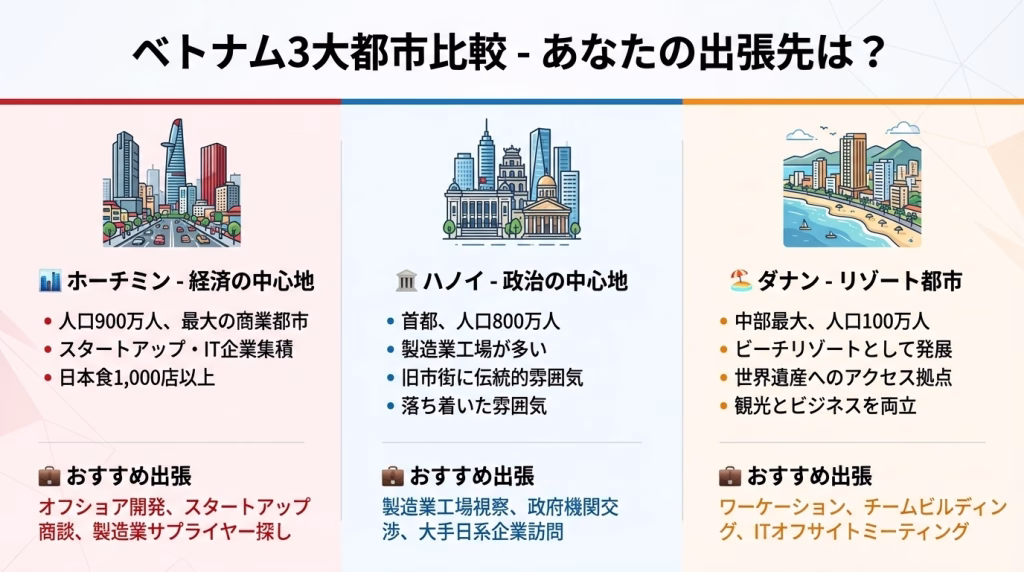 出張の合間に効率よく観光を楽しむコツ、商談相手との距離を縮める夜の過ごし方、現地でしか味わえないグルメスポット、さらには日本人が陥りがちなトラブル回避法まで、実体験に基づいた実践的な情報を網羅しています。この記事を読めば、初めてのベトナム出張でも、まるで何度も訪れたことがあるかのように自信を持って行動できるようになります。